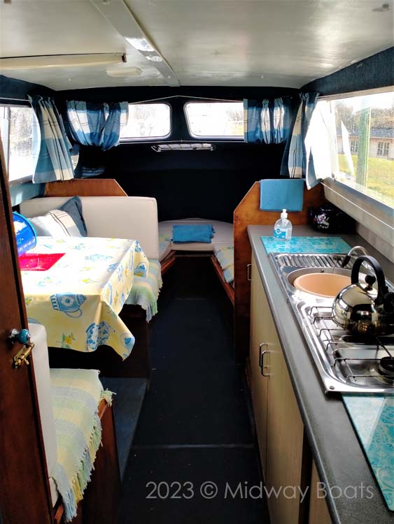Entering the cabin, to the port side we find the toilet cubicle, a brand new, unopened porta potti is included. To starboard and running further forward is the kitchen area providing ample worktop and storage space. This is also fitted with a gas grill, 2 burner gas hob, stainless sink and newly fitted electric waterpump. Opposite this is a 4 seater dinette that converts to a double berth. At the bow we find the usual ‘V’ shaped seating which also converts in to a double berth.
